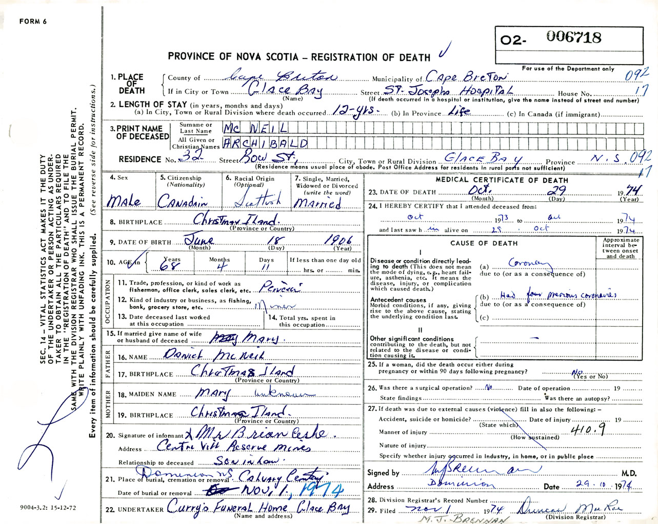 Male Death Registration: Year: 1974 number: 6718
