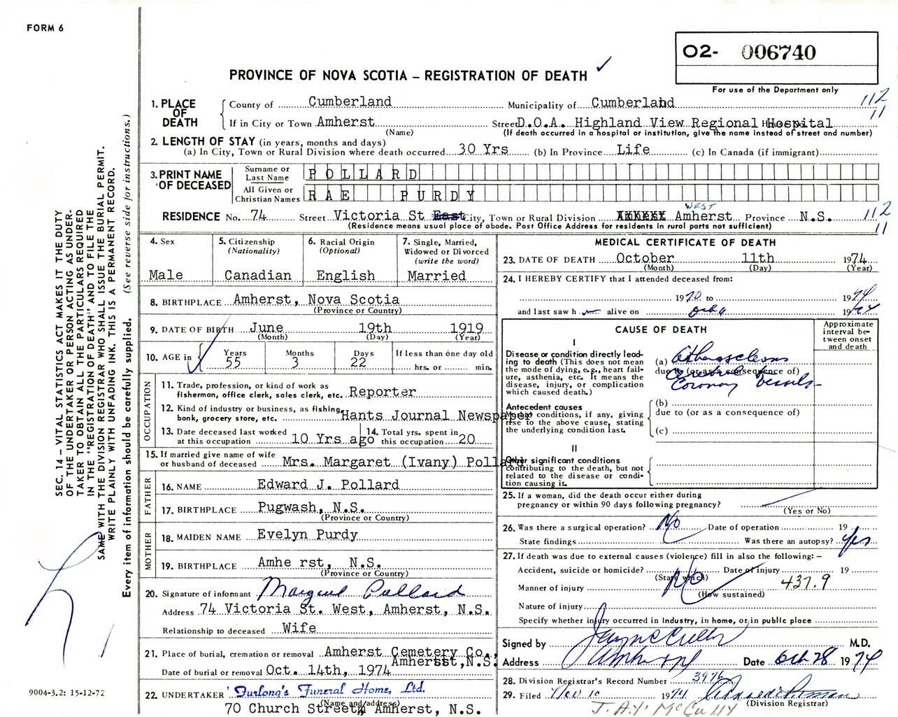 Male Death Registration: Year: 1974 number: 6740