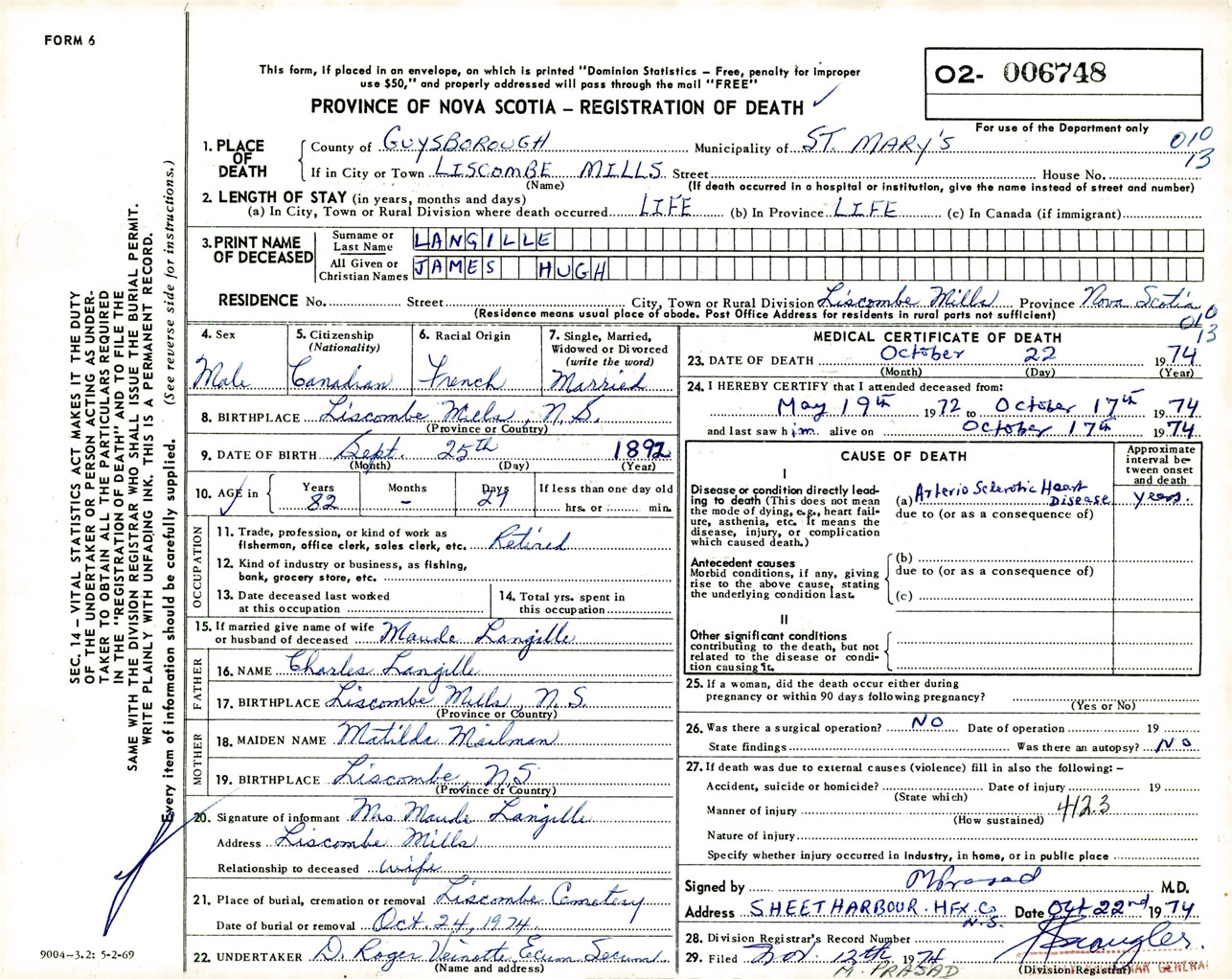 Male Death Registration: Year: 1974 number: 6748