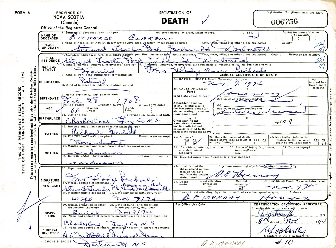 Male Death Registration: Year: 1974 number: 6756
