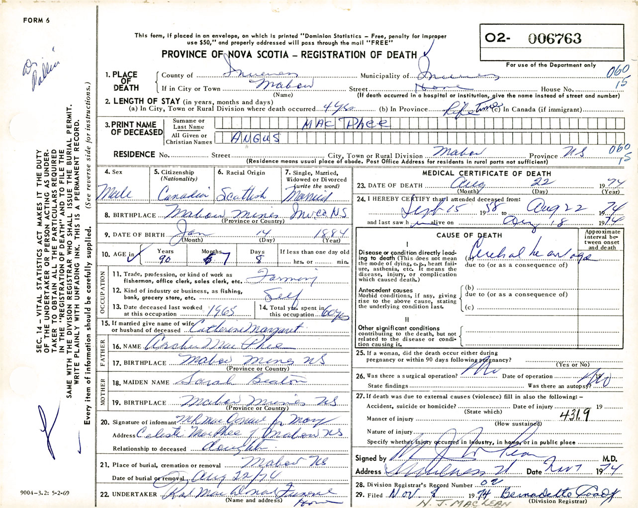 Male Death Registration: Year: 1974 number: 6763
