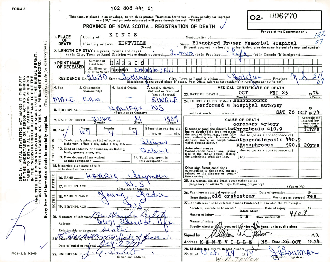 Male Death Registration: Year: 1974 number: 6770