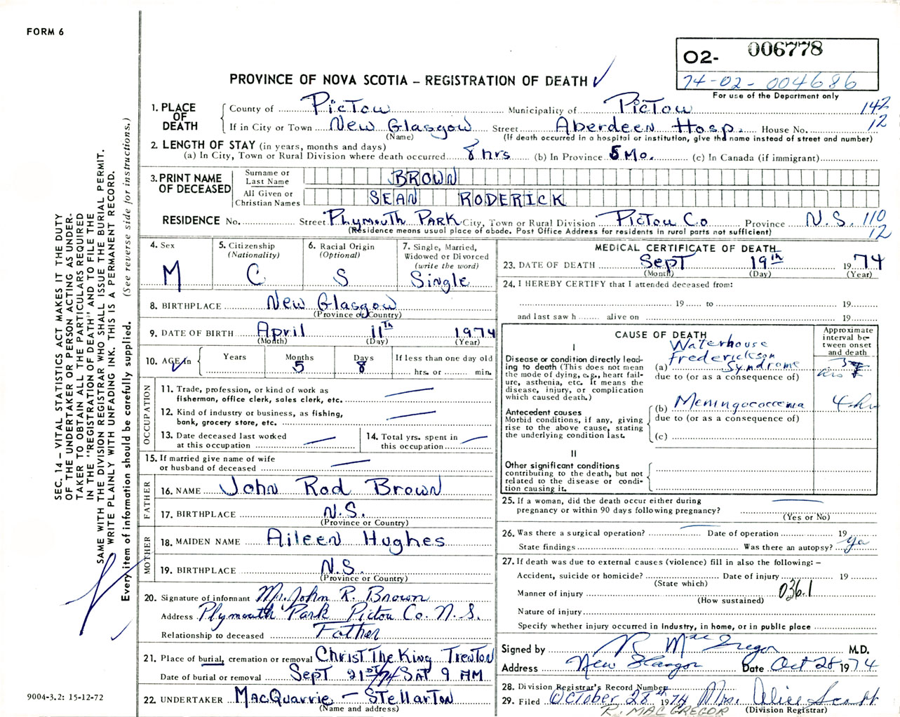 Male Death Registration: Year: 1974 number: 6778