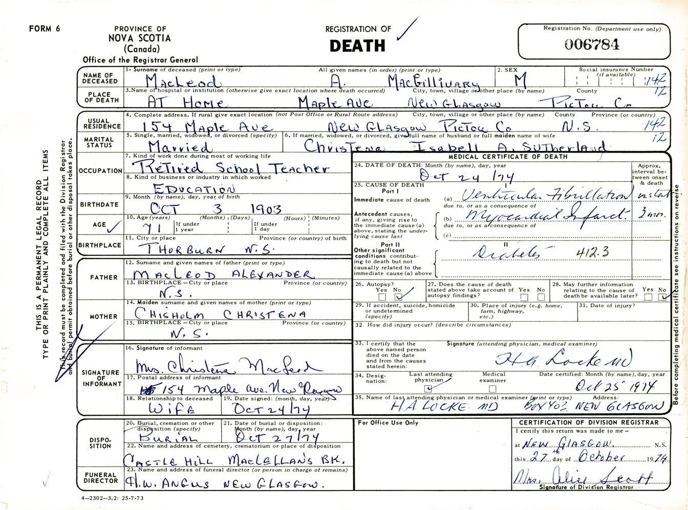 Male Death Registration: Year: 1974 number: 6784
