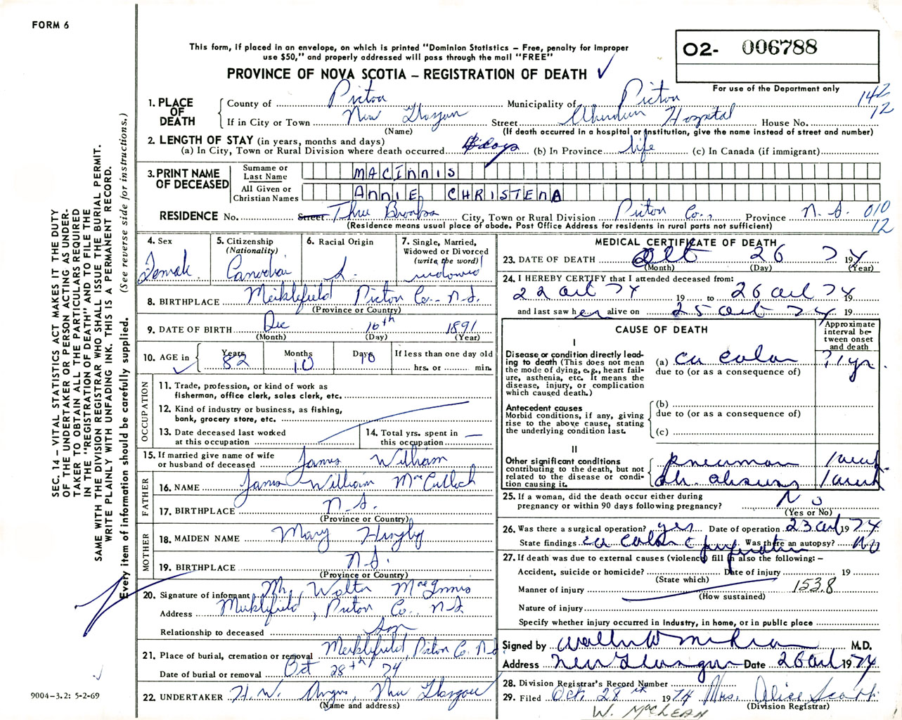 Female Death Registration: Year: 1974 number: 6788