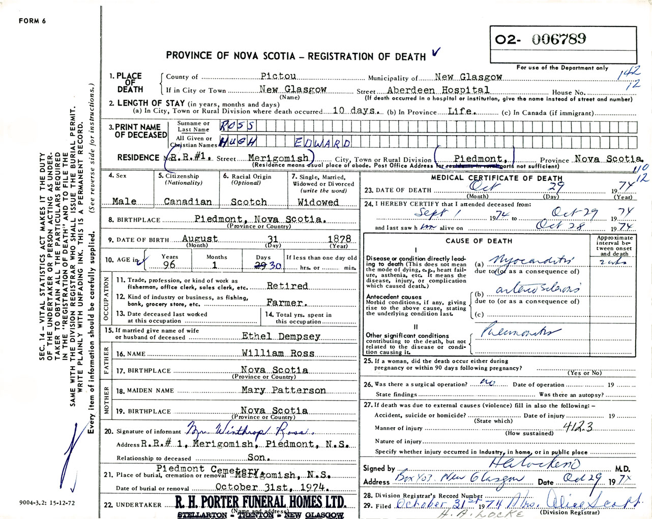 Male Death Registration: Year: 1974 number: 6789