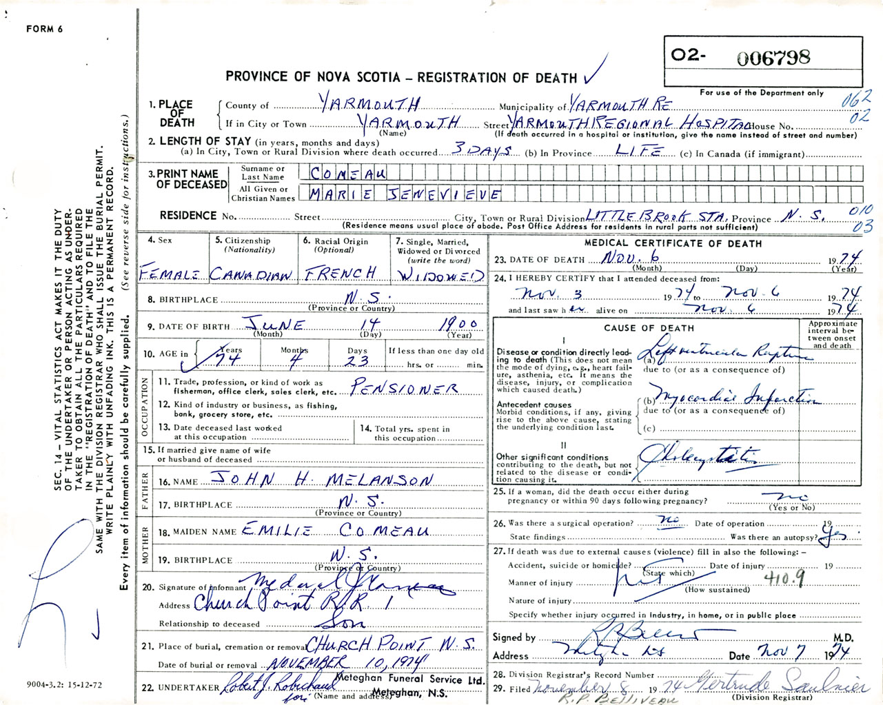Female Death Registration: Year: 1974 number: 6798