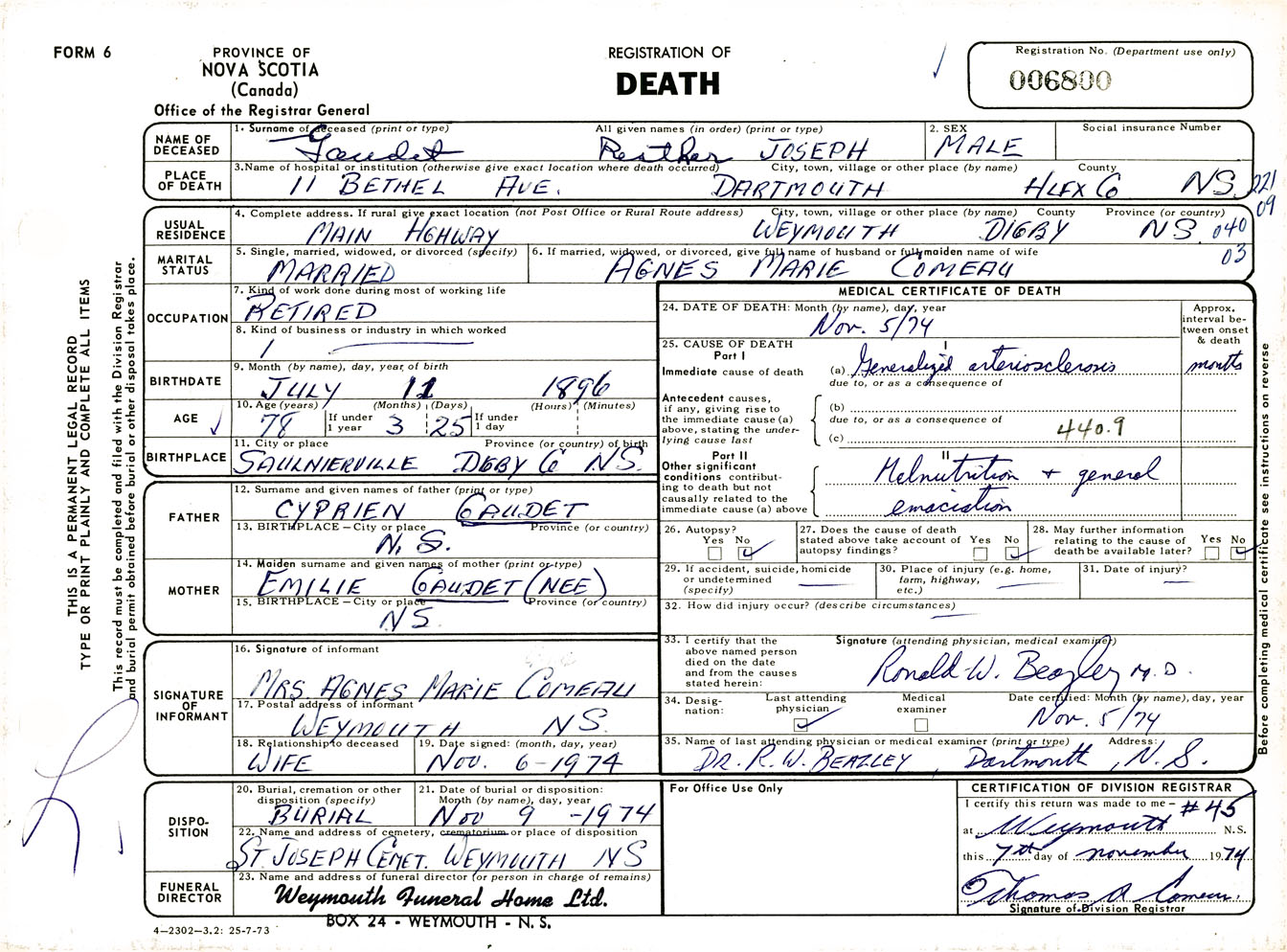 Male Death Registration: Year: 1974 number: 6800