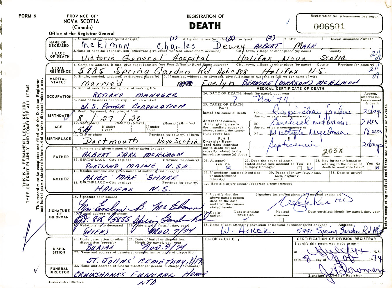 Male Death Registration: Year: 1974 number: 6801