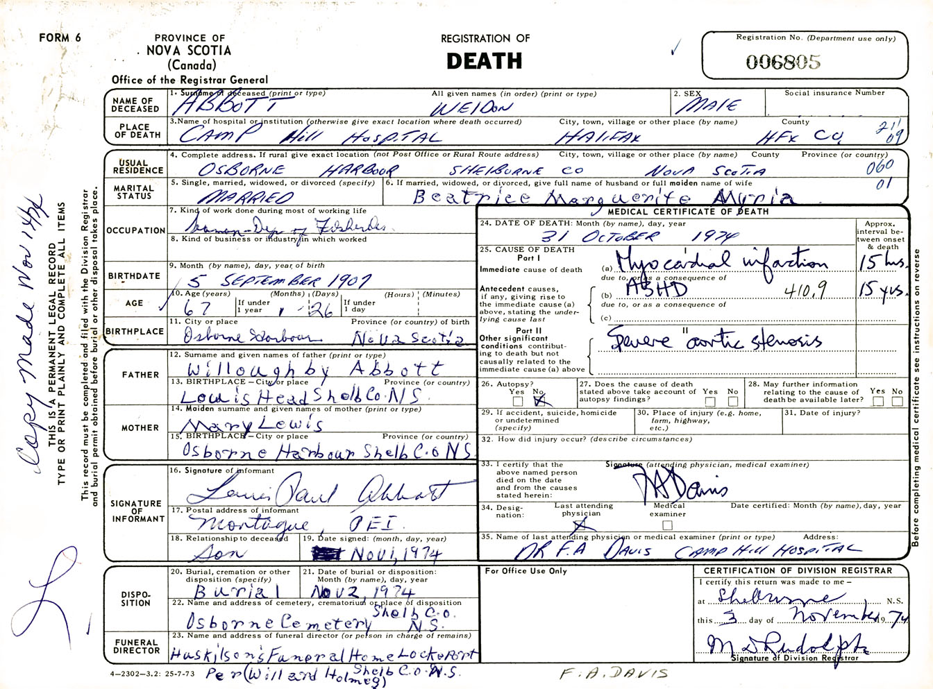 Male Death Registration: Year: 1974 number: 6805