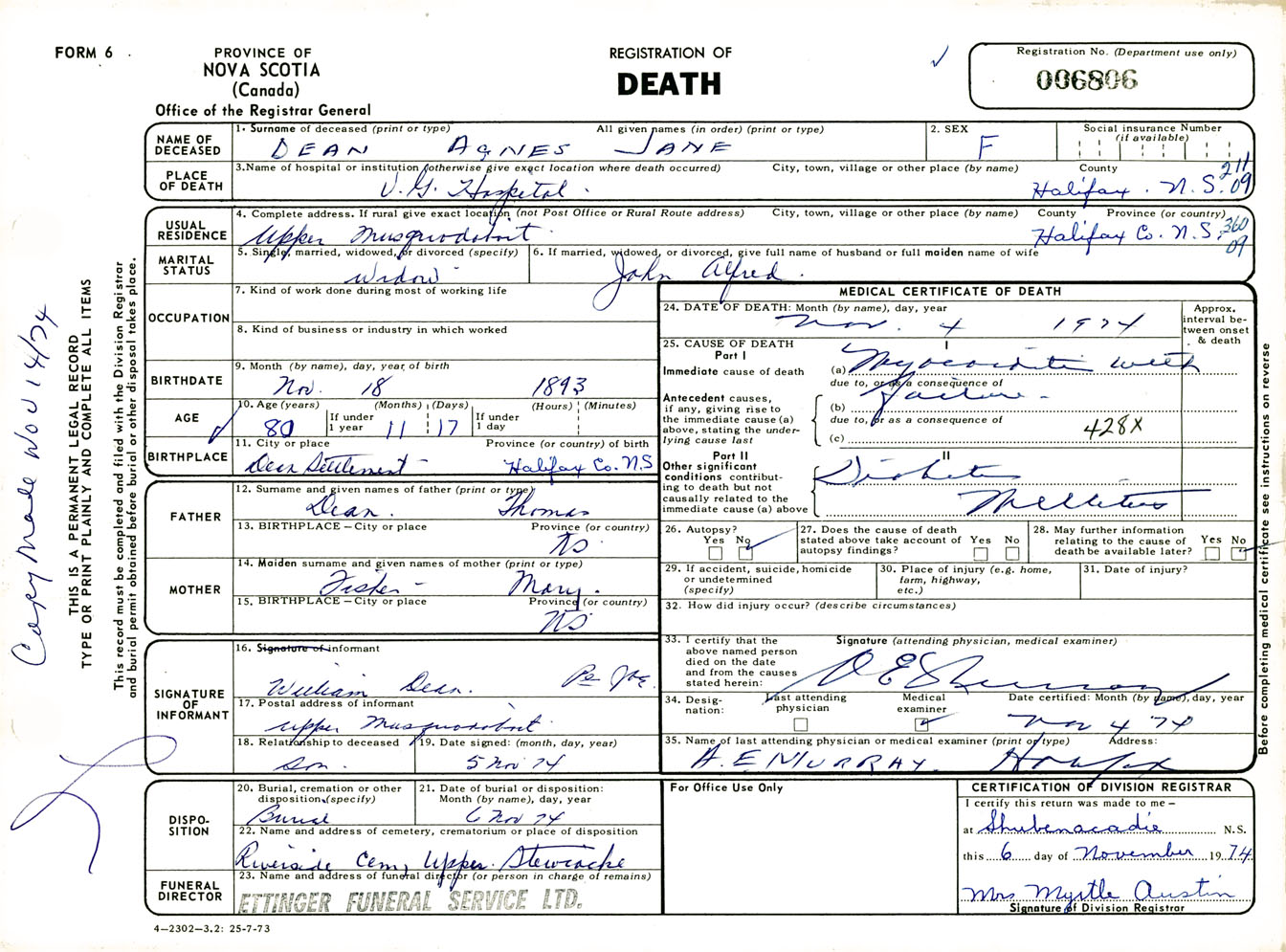 Female Death Registration: Year: 1974 number: 6806