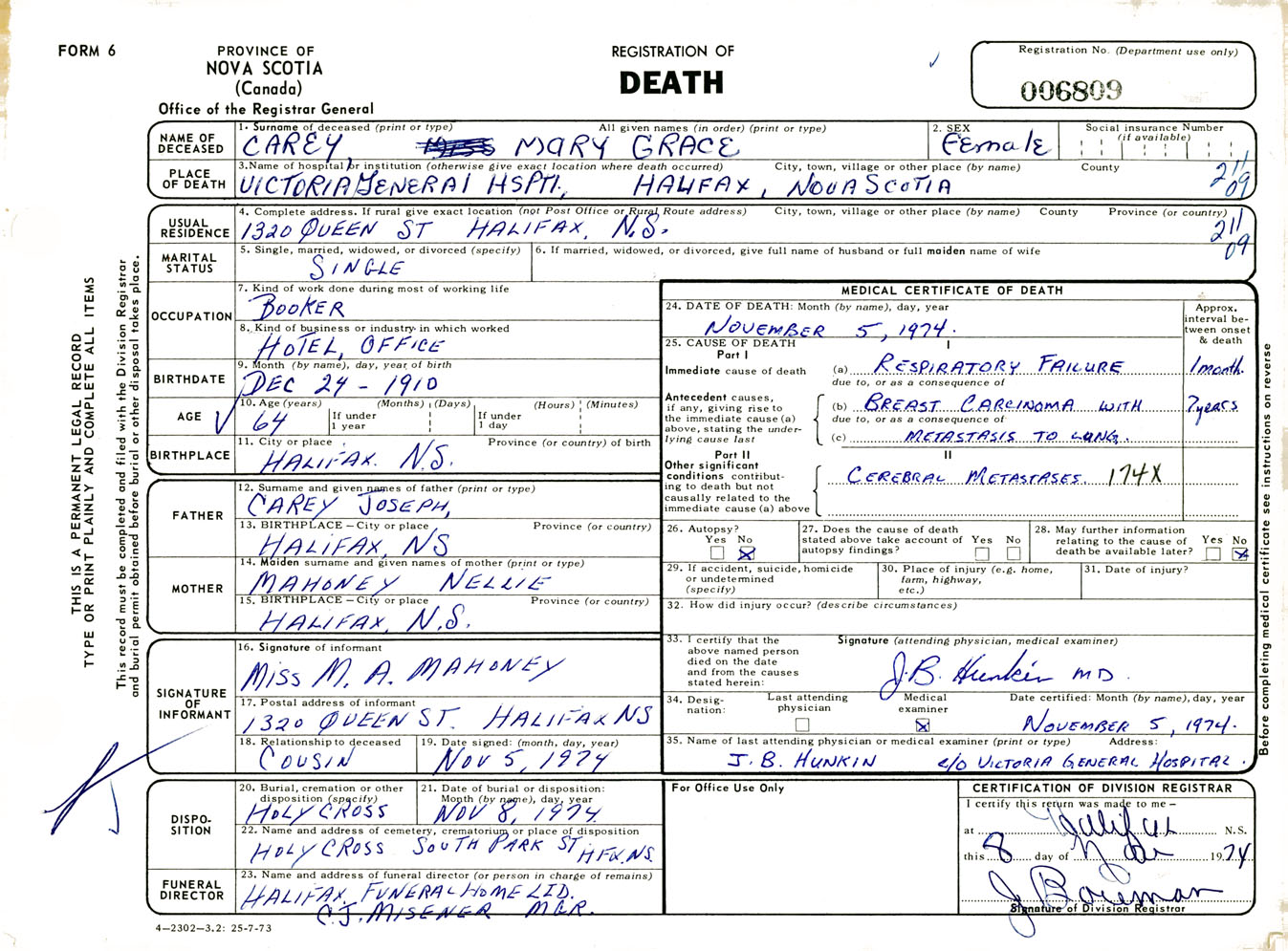 Female Death Registration: Year: 1974 number: 6809