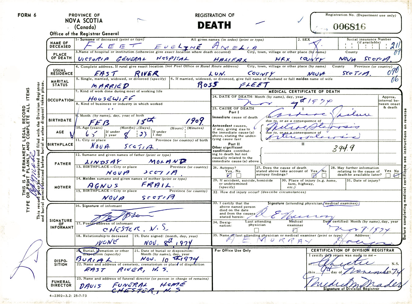 Female Death Registration: Year: 1974 number: 6816