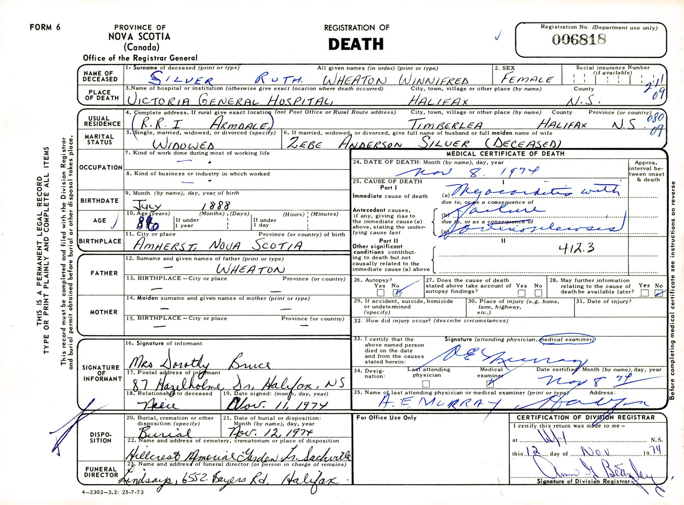 Female Death Registration: Year: 1974 number: 6818
