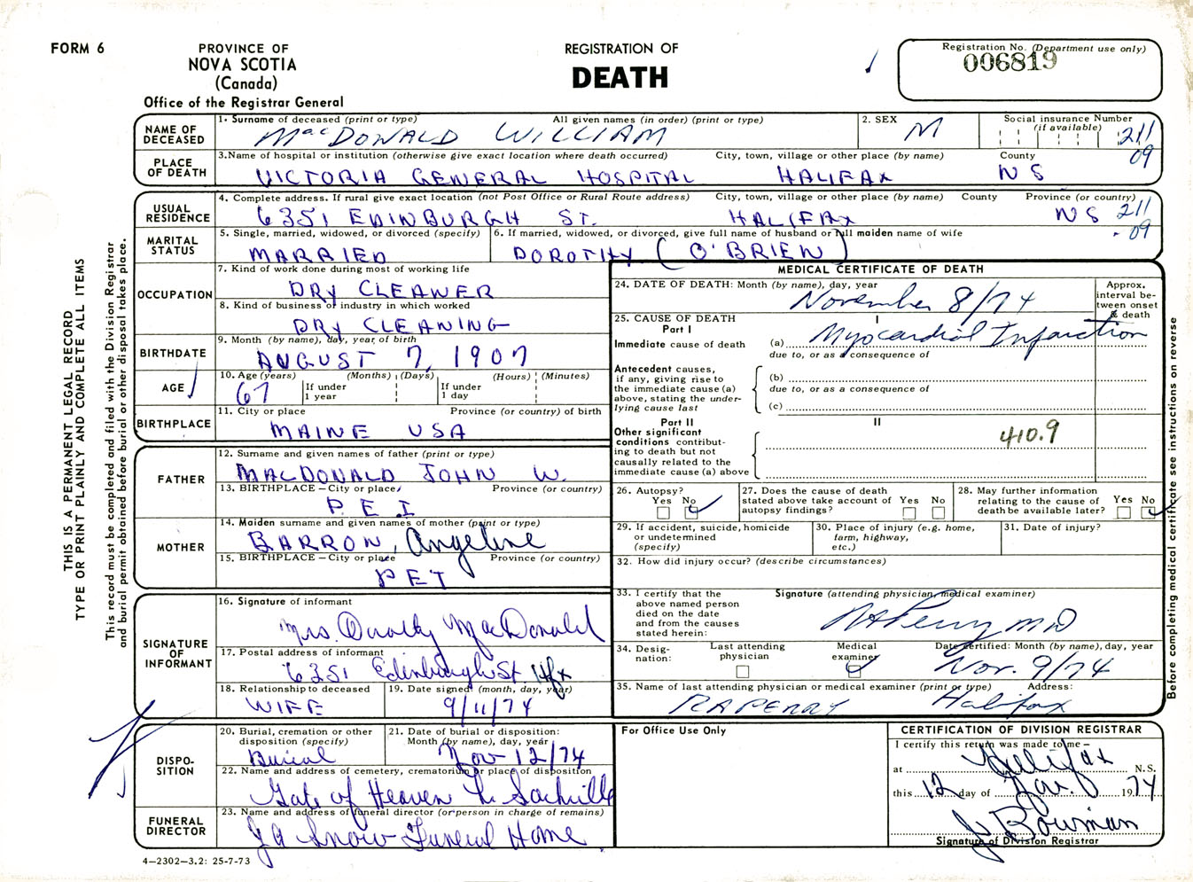 Male Death Registration: Year: 1974 number: 6819