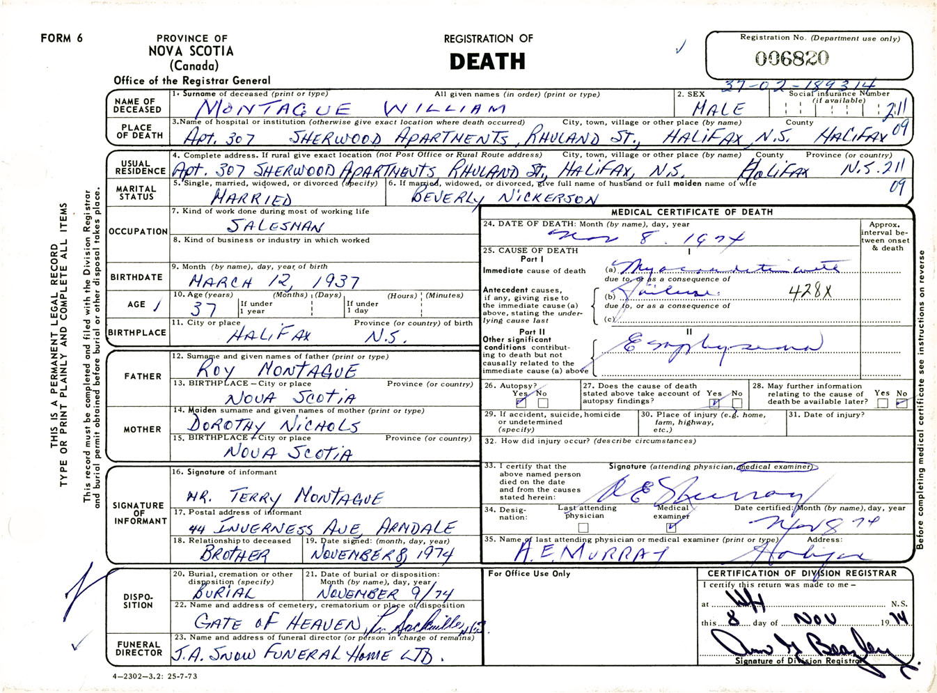 Male Death Registration: Year: 1974 number: 6820
