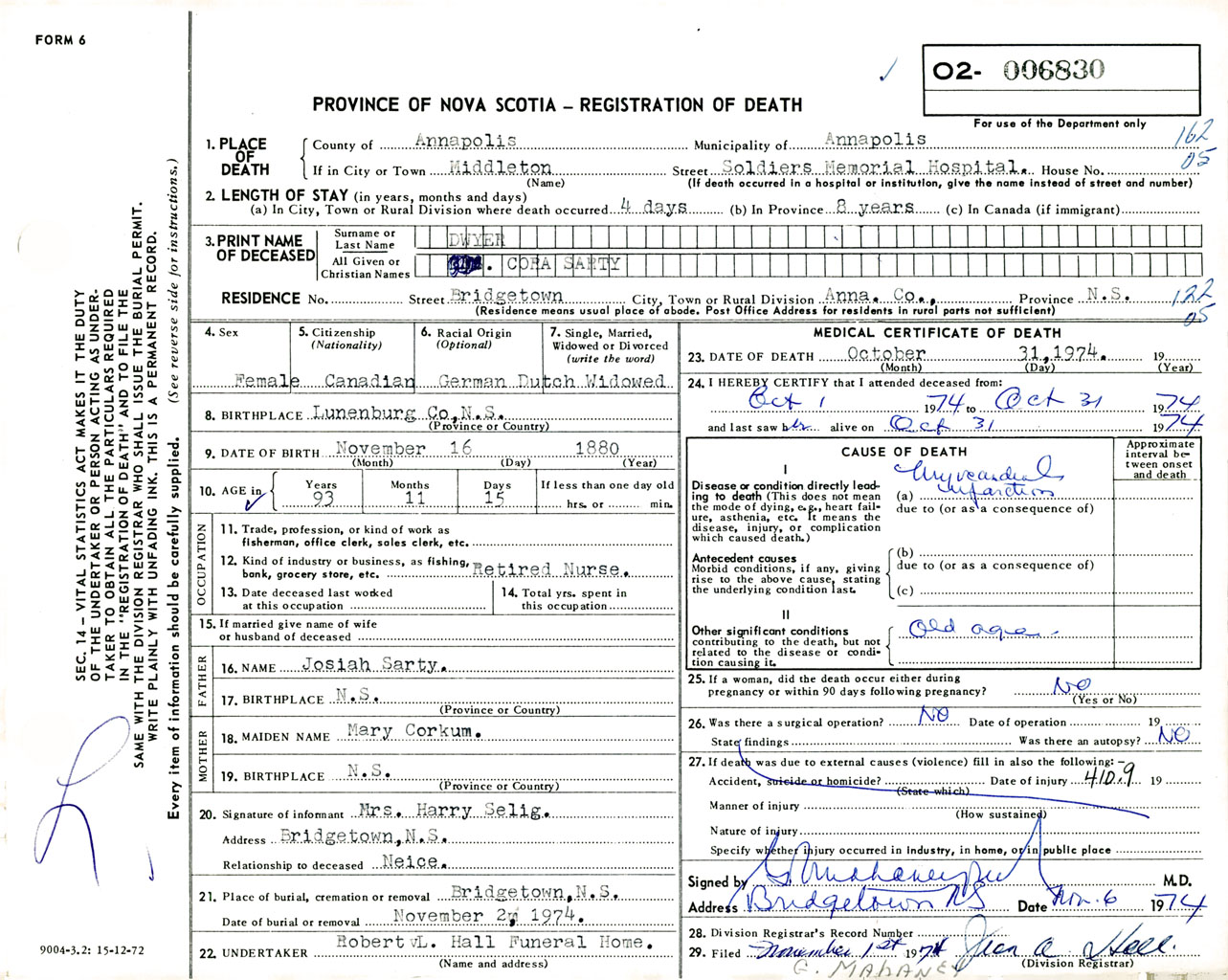 Female Death Registration: Year: 1974 number: 6830