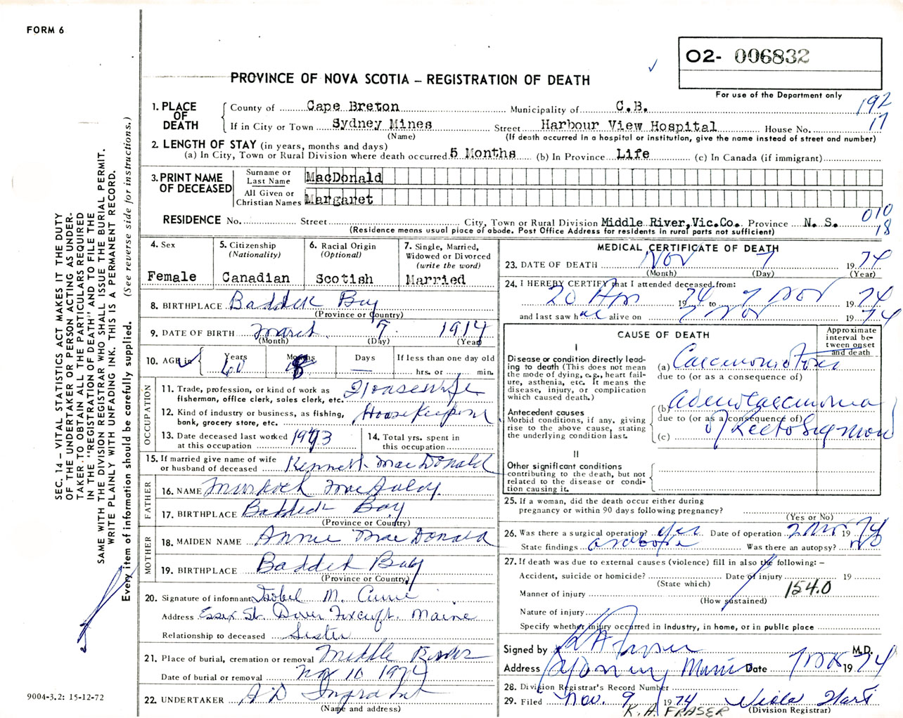 Female Death Registration: Year: 1974 number: 6832