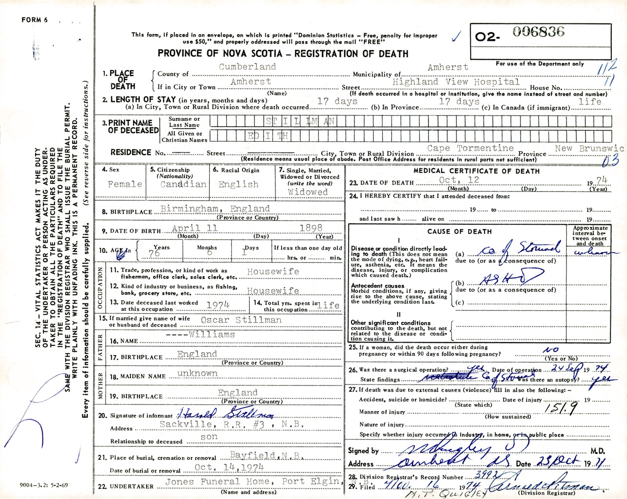 Female Death Registration: Year: 1974 number: 6836
