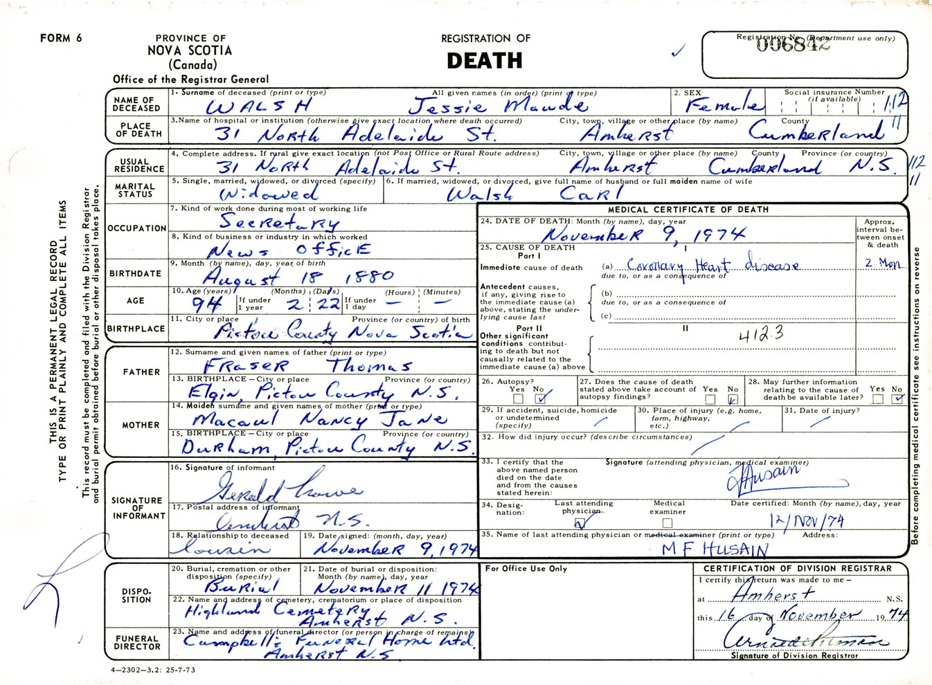 Female Death Registration: Year: 1974 number: 6842