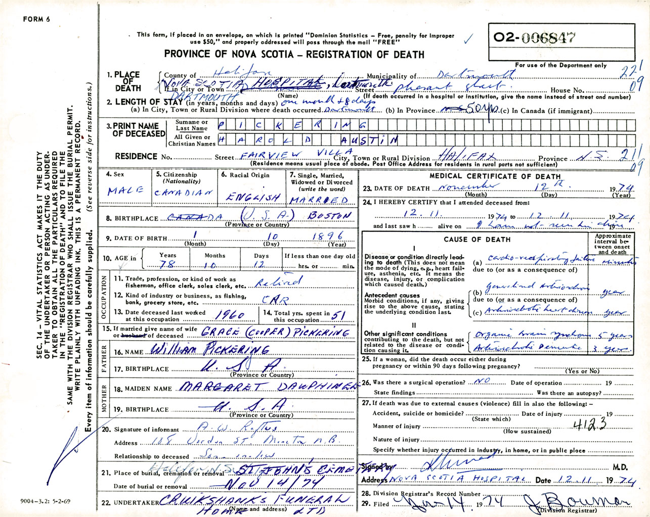 Male Death Registration: Year: 1974 number: 6847