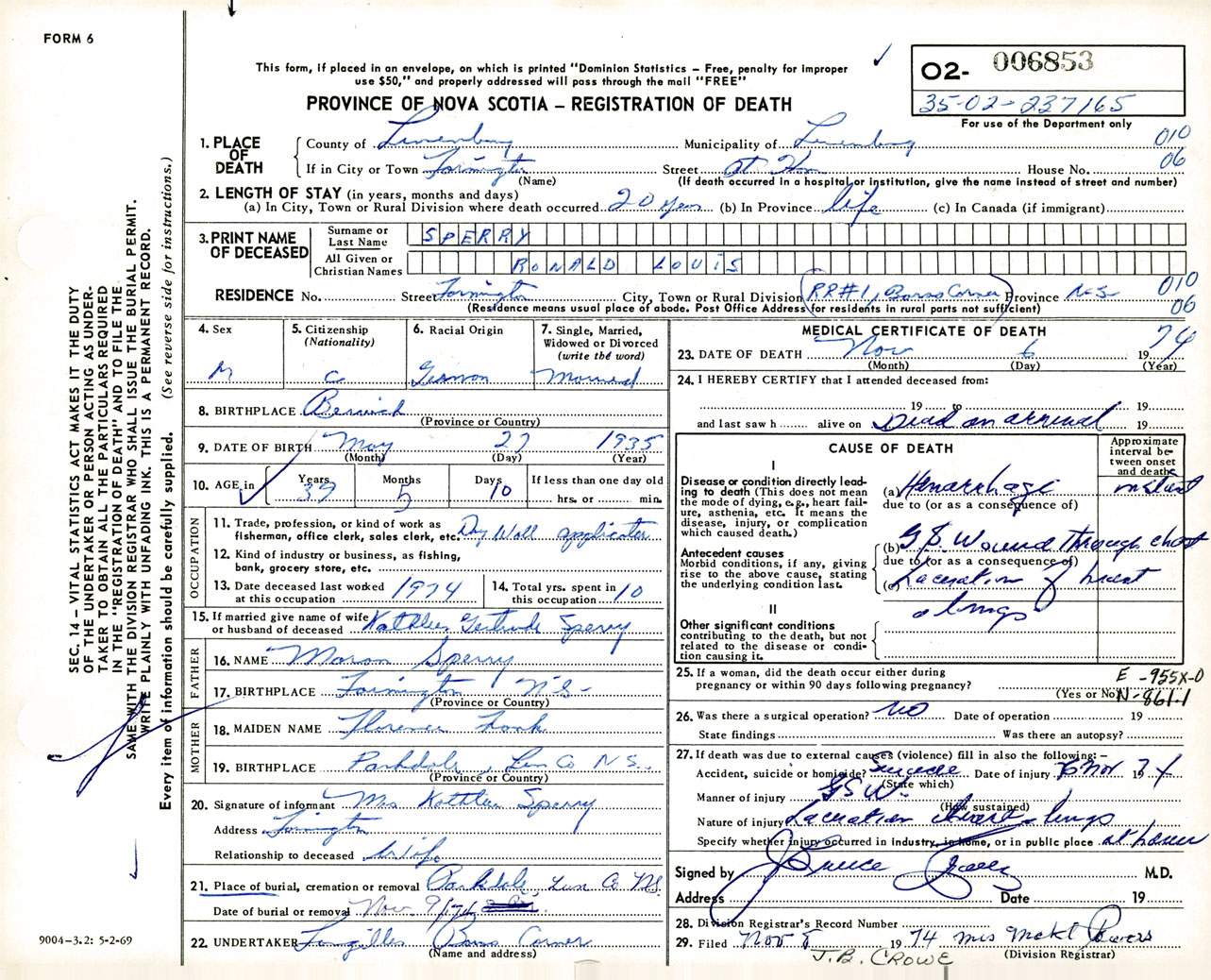 Male Death Registration: Year: 1974 number: 6853