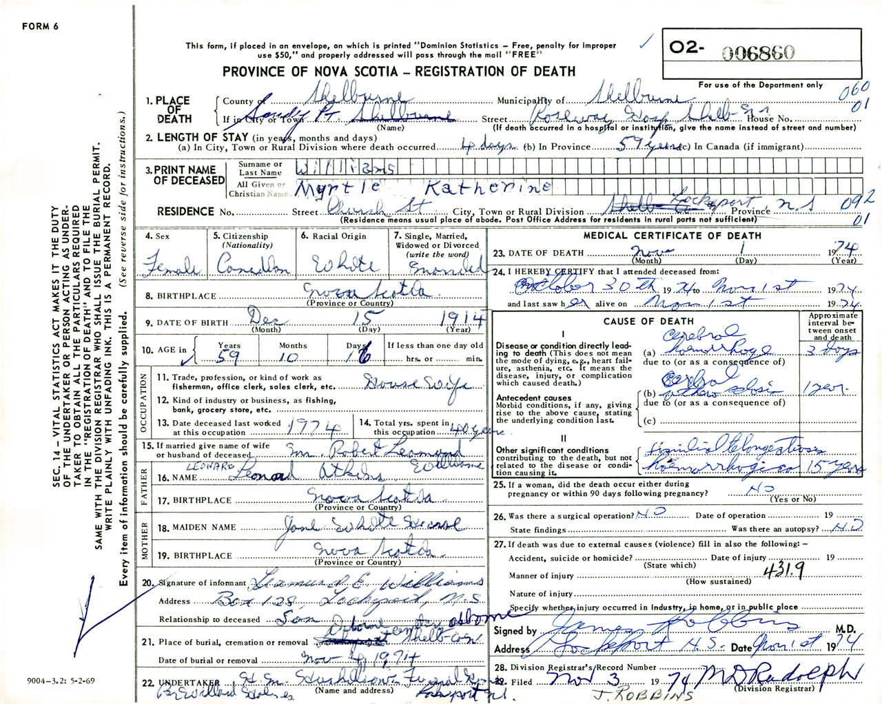 Female Death Registration: Year: 1974 number: 6860