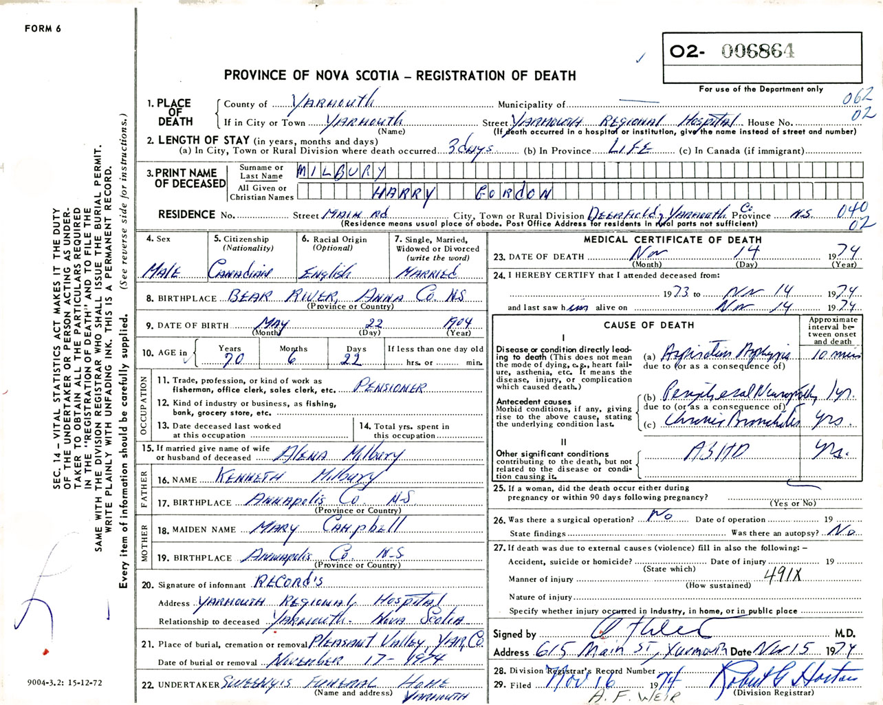 Male Death Registration: Year: 1974 number: 6864