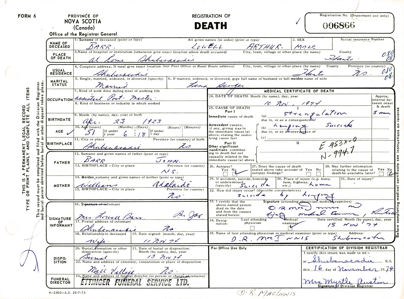 Male Death Registration: Year: 1974 number: 6866