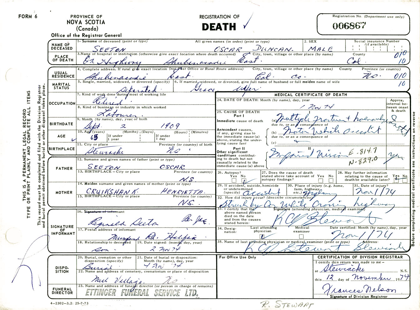 Male Death Registration: Year: 1974 number: 6867
