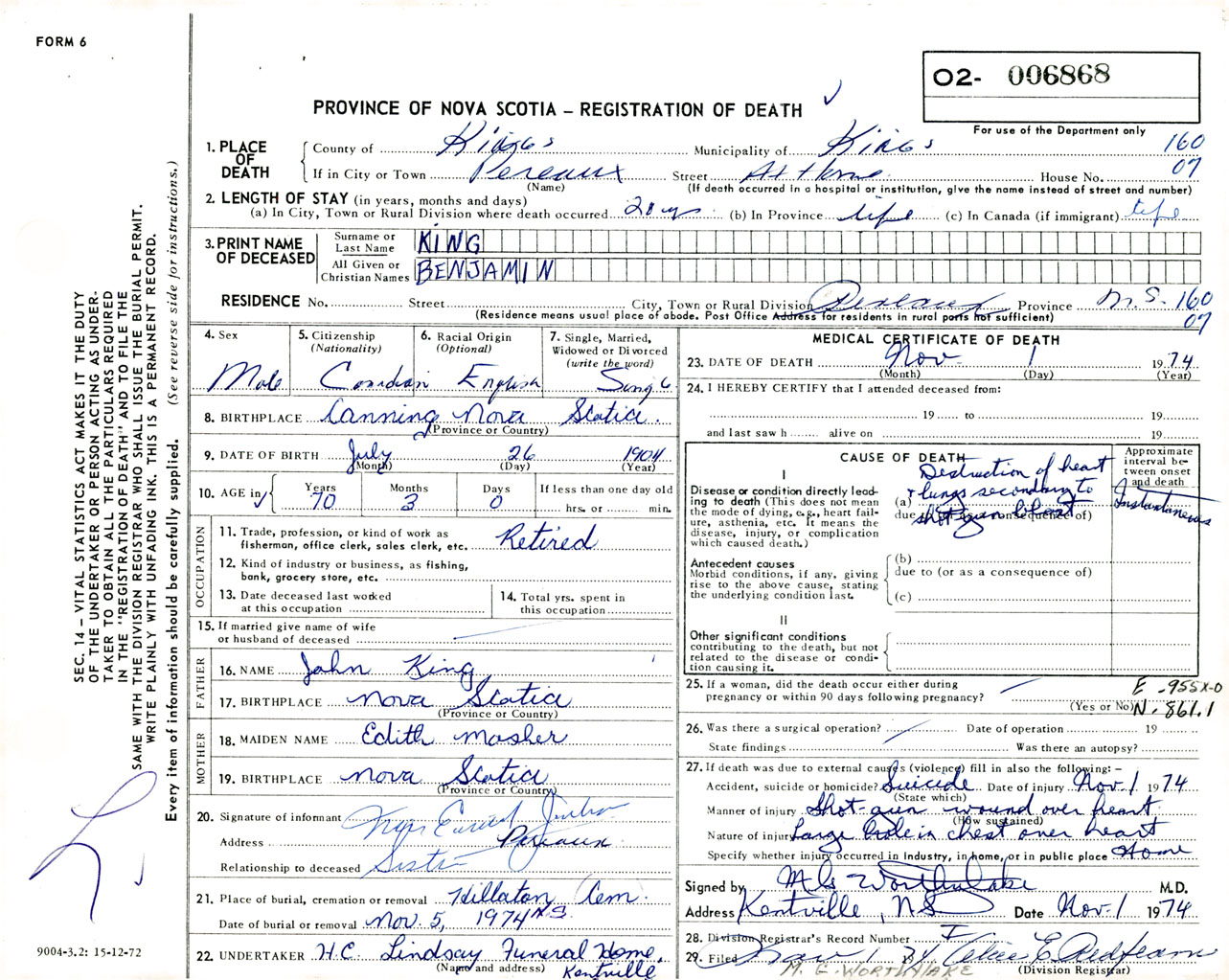 Male Death Registration: Year: 1974 number: 6868