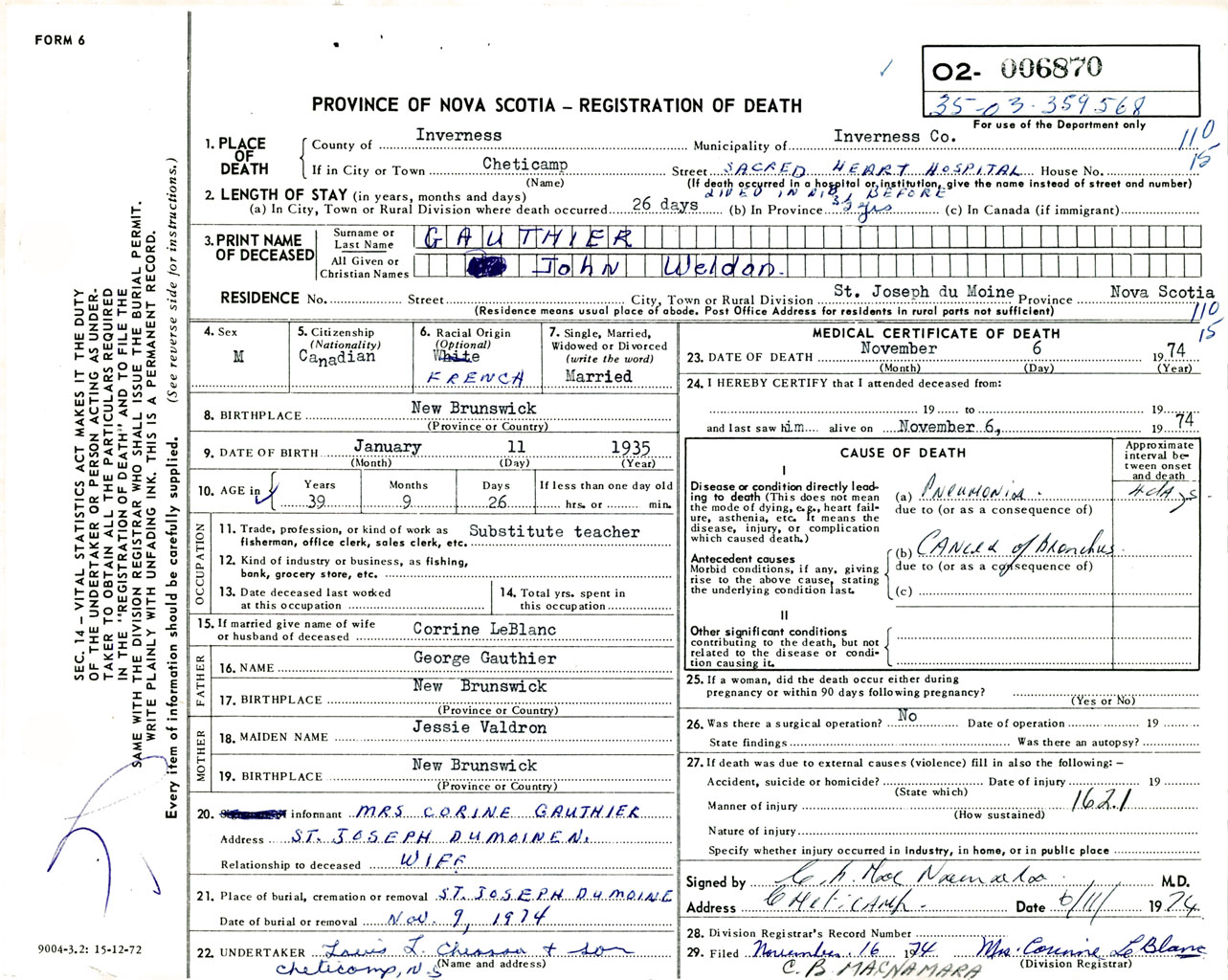 Male Death Registration: Year: 1974 number: 6870
