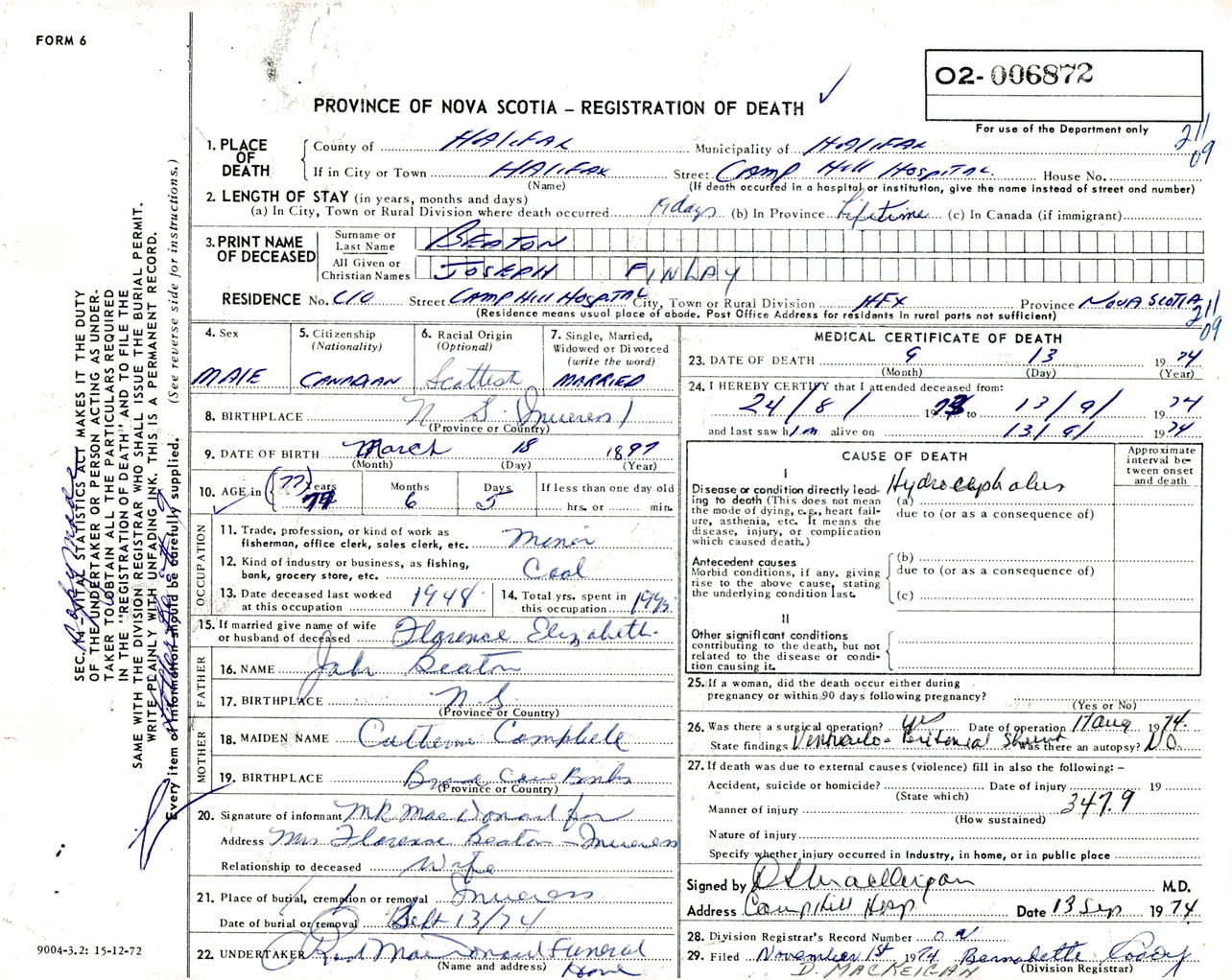 Male Death Registration: Year: 1974 number: 6872