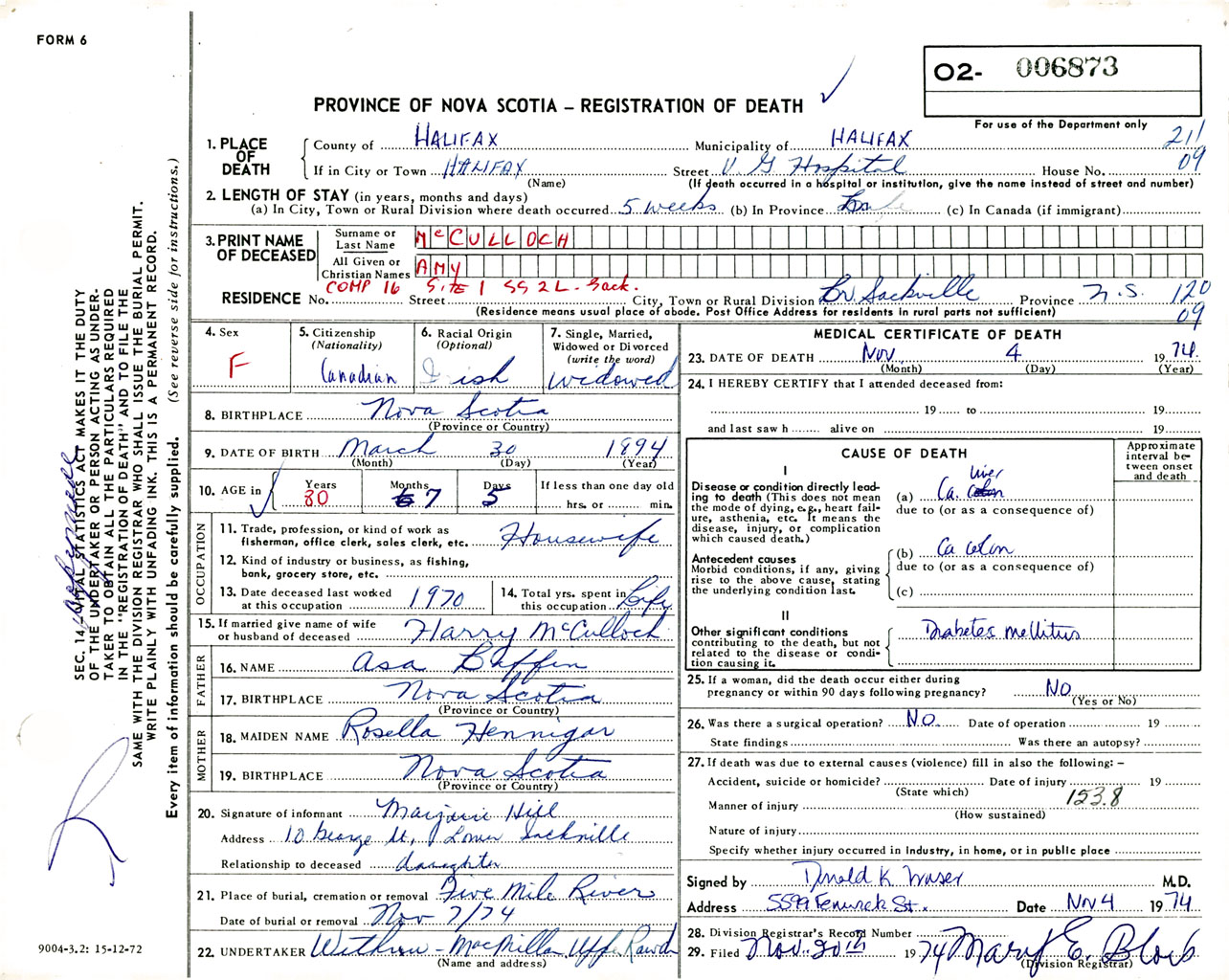 Female Death Registration: Year: 1974 number: 6873