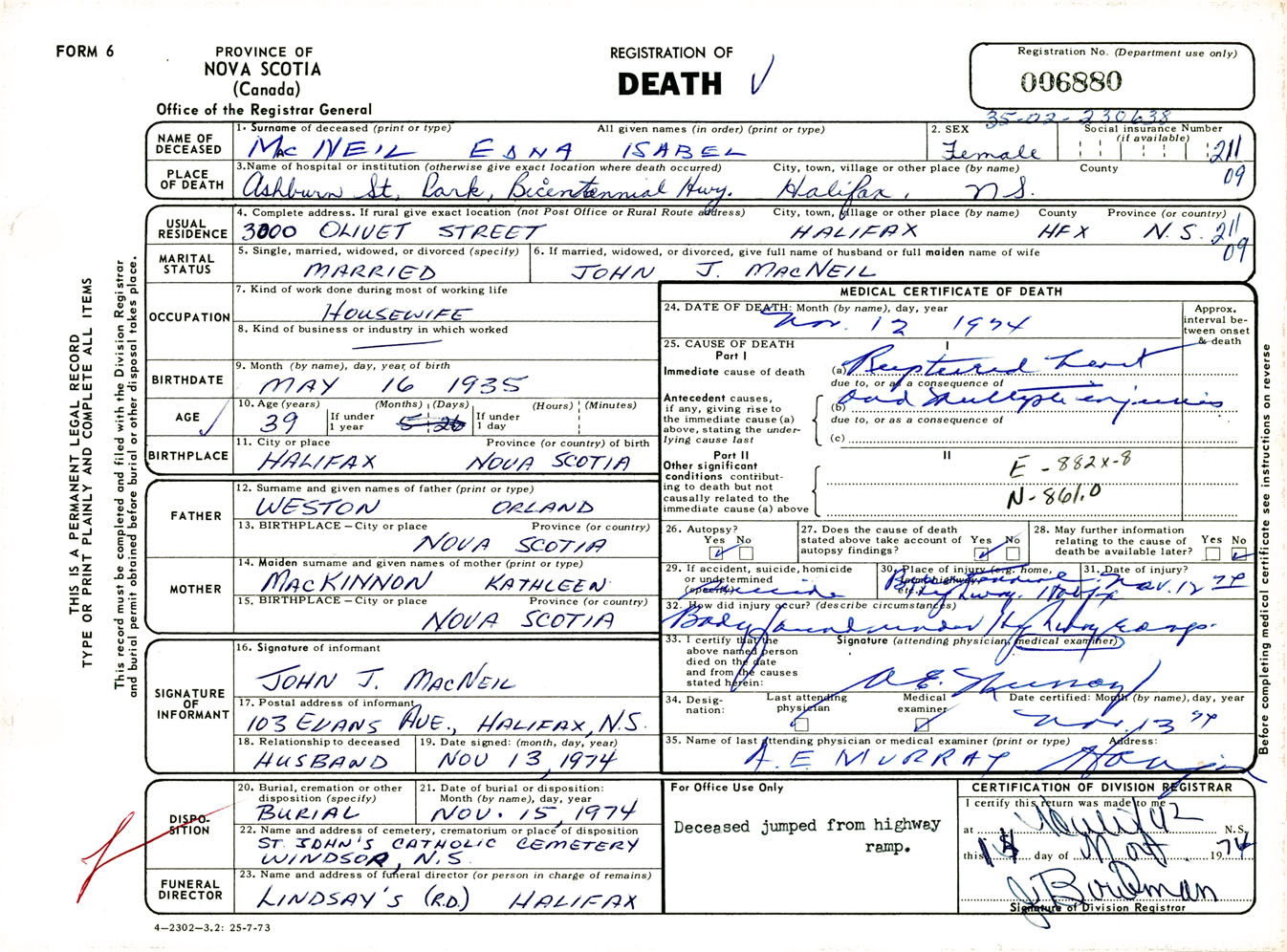 Female Death Registration: Year: 1974 number: 6880