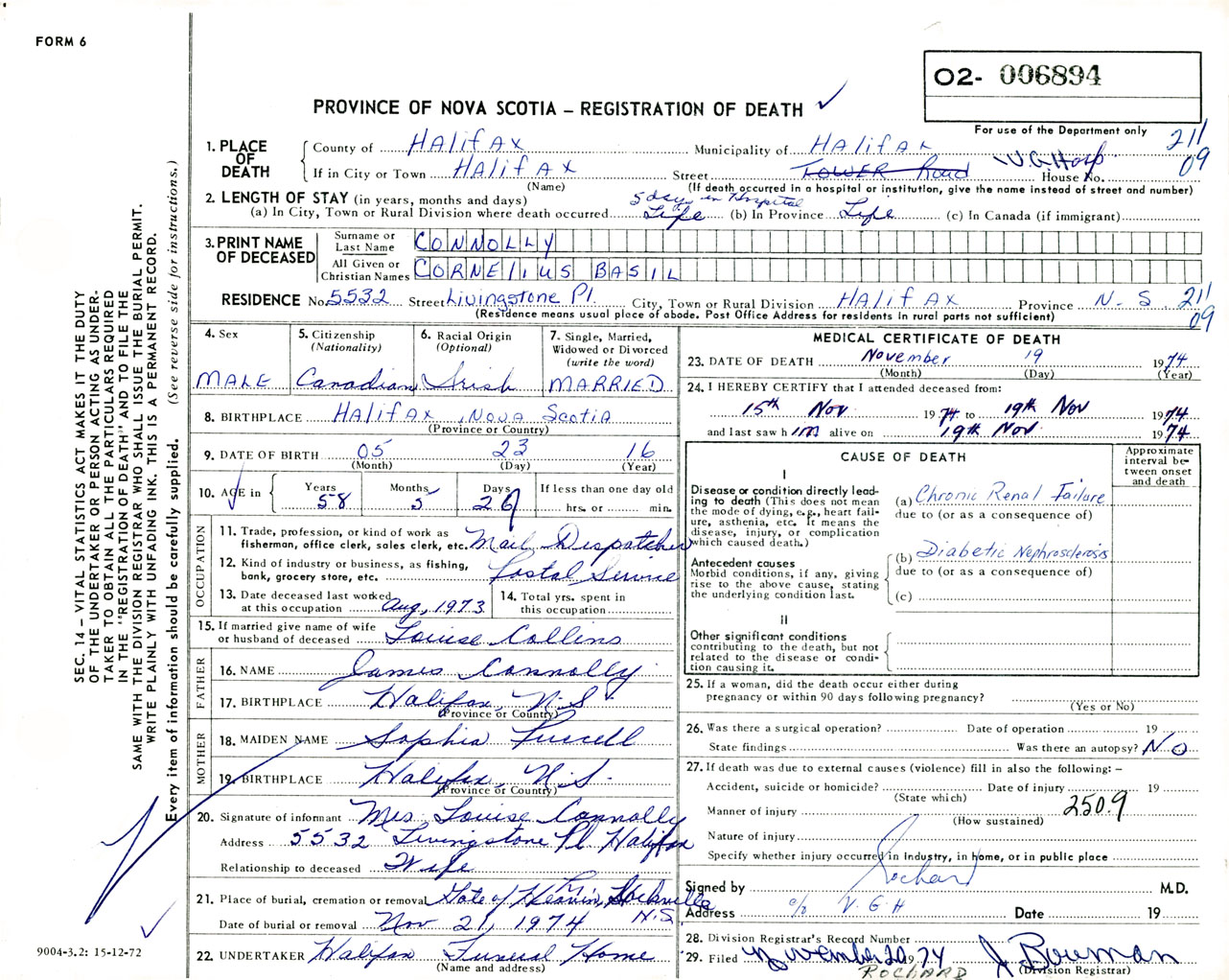 Male Death Registration: Year: 1974 number: 6894
