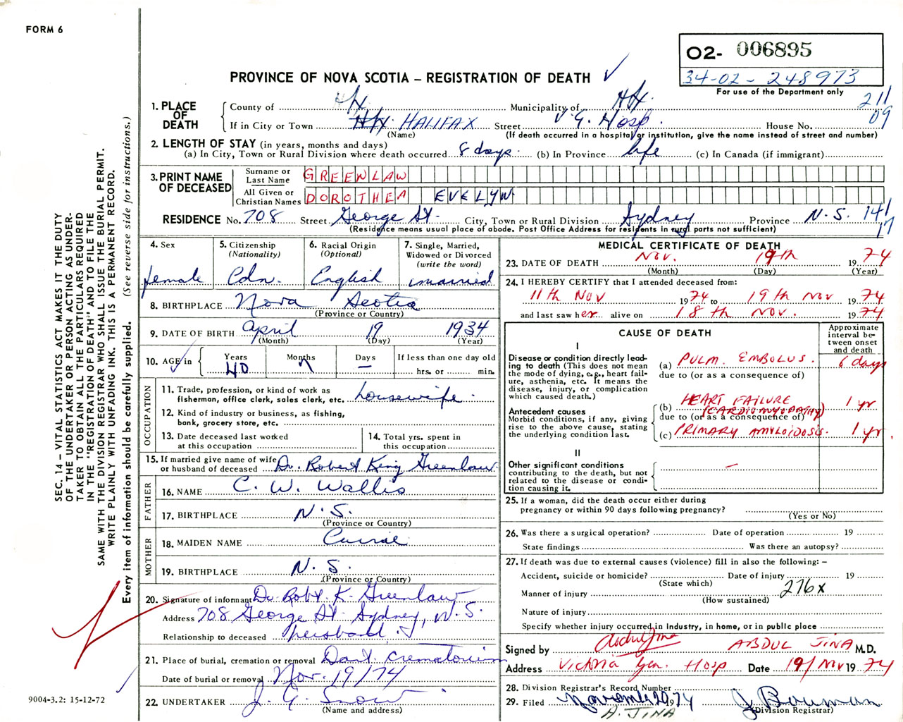 Female Death Registration: Year: 1974 number: 6895