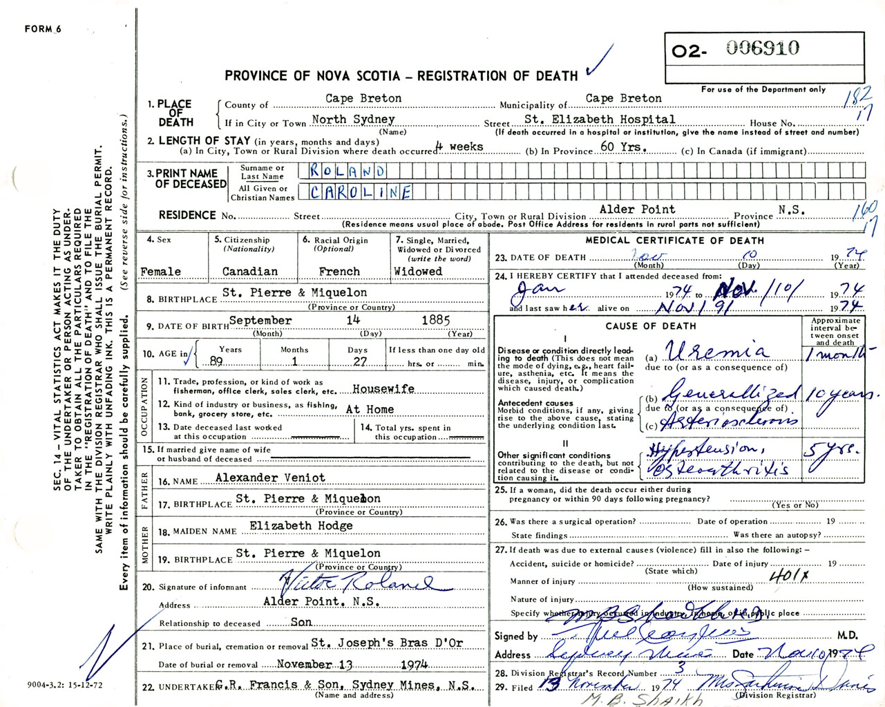 Female Death Registration: Year: 1974 number: 6910