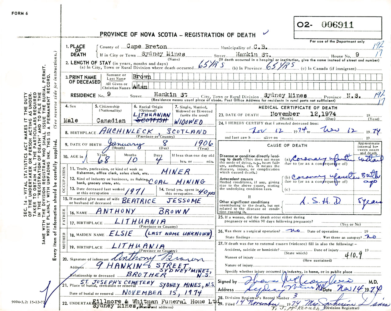 Male Death Registration: Year: 1974 number: 6911