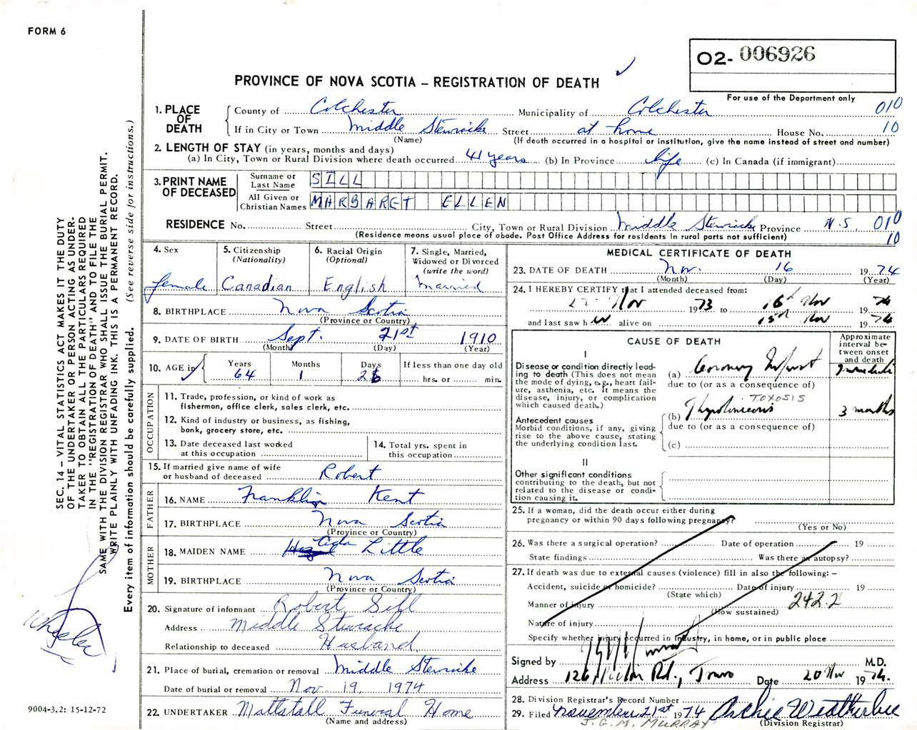 Female Death Registration: Year: 1974 number: 6926