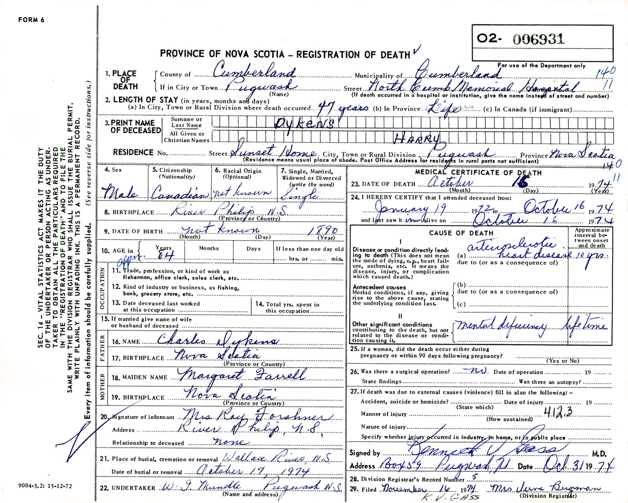 Male Death Registration: Year: 1974 number: 6931