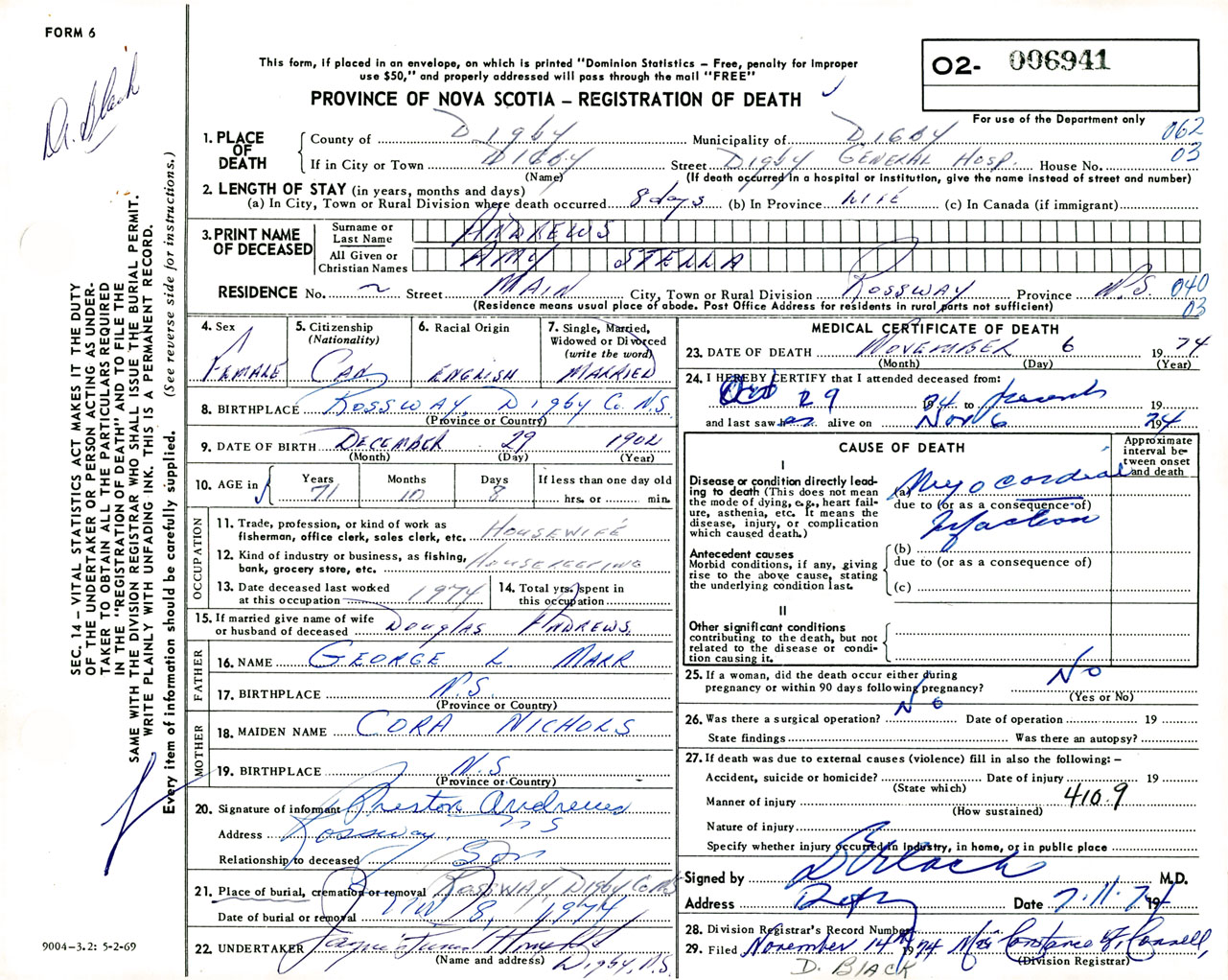 Female Death Registration: Year: 1974 number: 6941