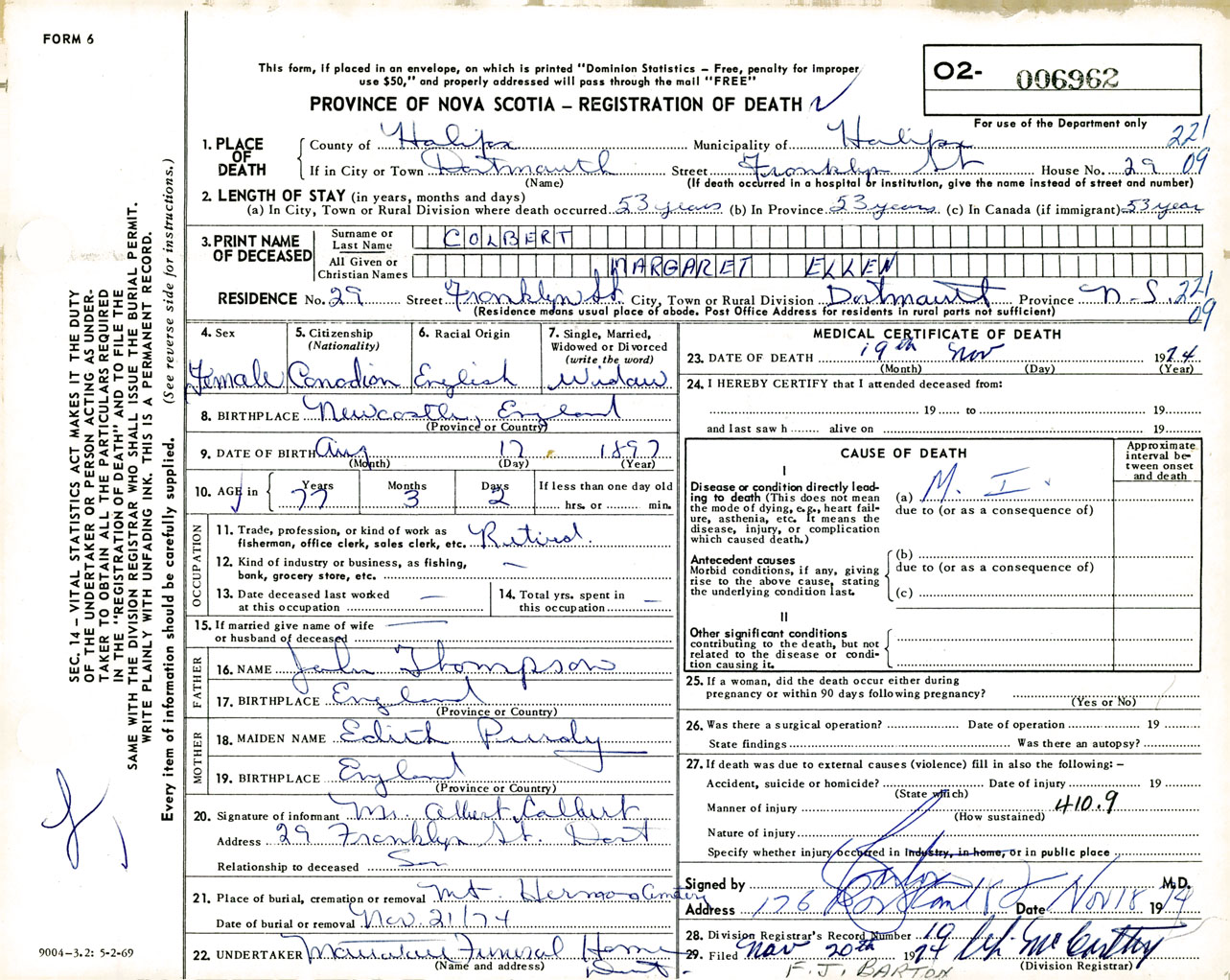Female Death Registration: Year: 1974 number: 6962