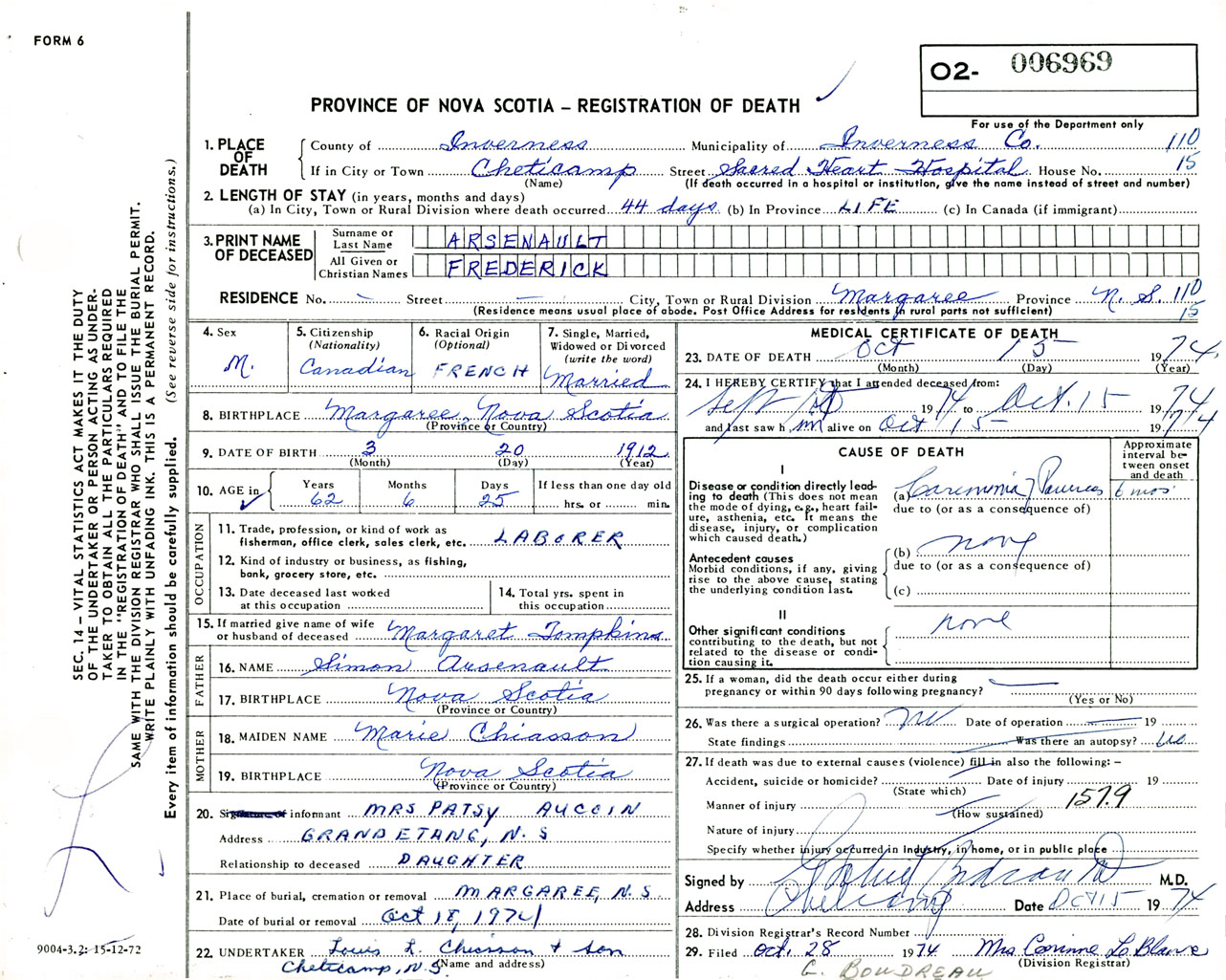 Male Death Registration: Year: 1974 number: 6969
