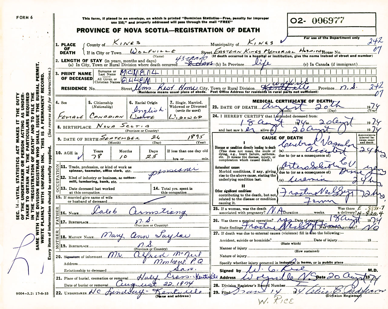 Female Death Registration: Year: 1974 number: 6977