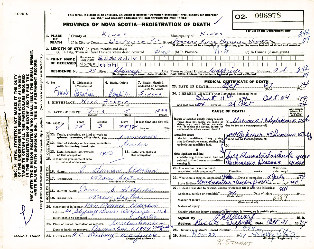 Female Death Registration: Year: 1974 number: 6978