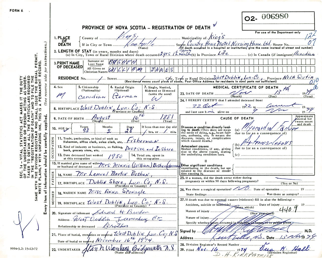 Male Death Registration: Year: 1974 number: 6980