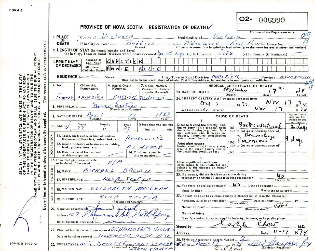 Female Death Registration: Year: 1974 number: 6999