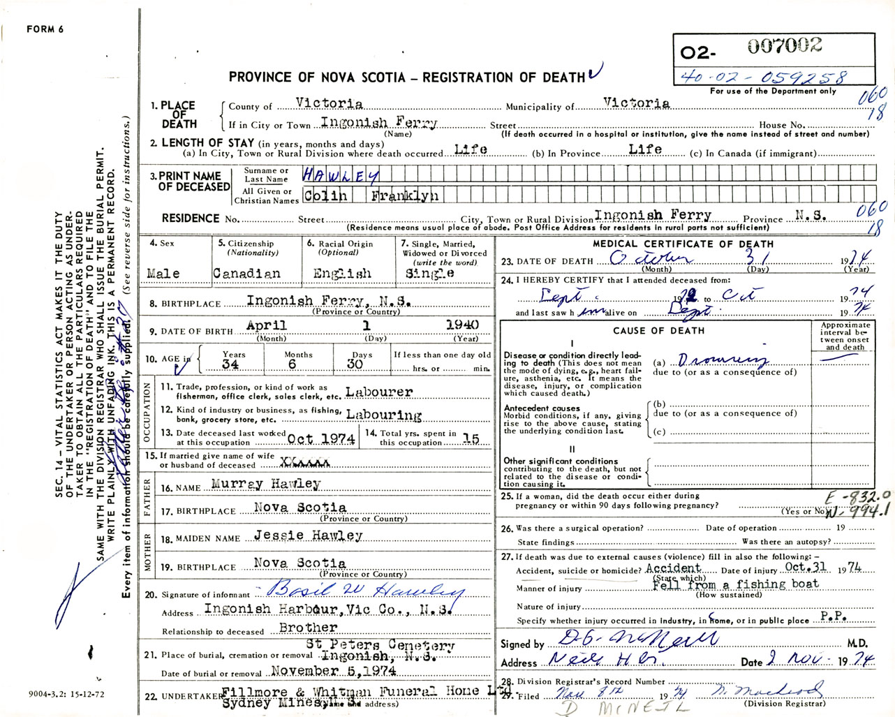 Male Death Registration: Year: 1974 number: 7002