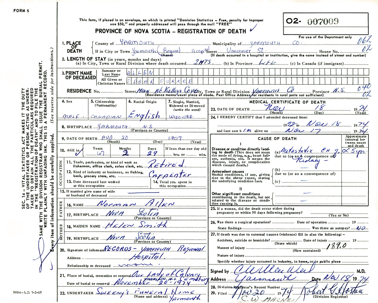 Male Death Registration: Year: 1974 number: 7009